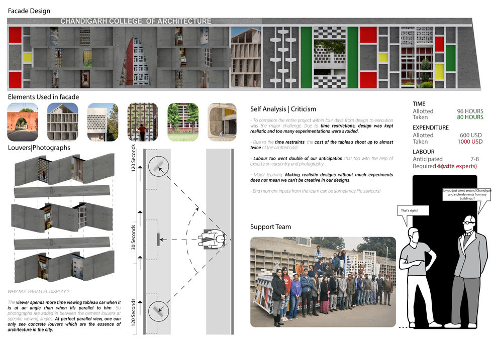 Designing the Chandigarh Republic Day tableau taught me how to communicate architectural ideas to a broad public audience under intense time constraints. I learned to distill Corbusier’s design language into simple, readable forms that still carried meaning — louvers, facades, and sectional ideas were transformed into a dynamic, moving display.